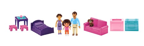 Includes: Dora, Mami, Papi, Perrito, bed, couch, oven, sink, craft table that transforms into a tea table and 2 stools