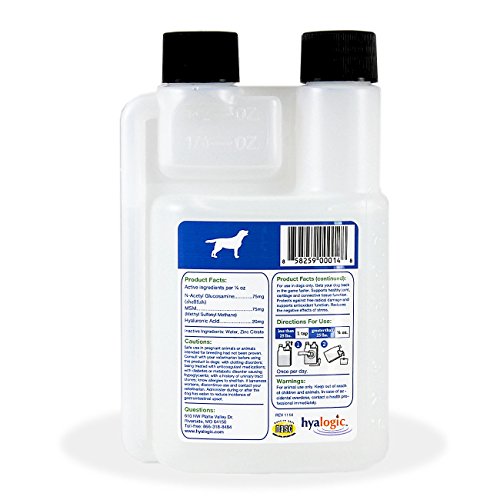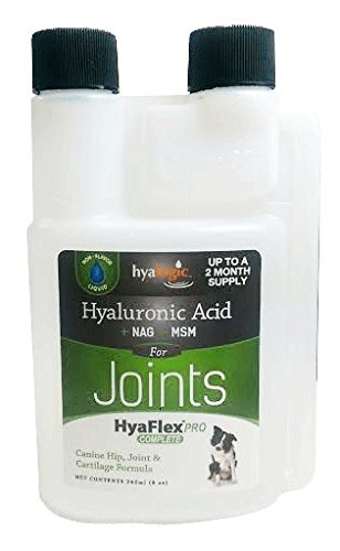Hyalogic HyaFlexPro Complete Liquid gives dogs an all-inclusive joint supplement that supports healthy joints, cartilage, and connective tissue function. Containing n-acetyl glucosamine, hyaluronic acid and MSM (Methyl Sulfonyl Methane), these ingredients provide joint, cartilage and connective tissue support. 20 mg per serving of Hyaluronic Acid (HA), the natural lubricant for the joint, 75 mg of N-Acetyl Glucosamine (NAG) and 75 mg MSM. HA can hold up to 1,000 times its weight in water and it provides lubrication and shock absorbing properties for the joints. HA is naturally produced by the body. As your dog ages, it produces less HA. NAG is an essential building block of the HA Molecule and helps to support and maintain proper levels of HA in the body, ensuring healthy joint fluid. MSM balances the naturally occurring enzyme in the body that breaks down HA. HyaFlexPro Complete Liquid supports the body's natural inflammatory response, joint and cartilage health. Reduces the negative effects of stress. Ideal for show dogs, active pets, dogs under physical stress, active breeds and recovering dogs. Available in liquid. The HA in all of our products is plant based, vegetarian and vegan. Hyalogic is the pioneer in HA based supplements!Feature