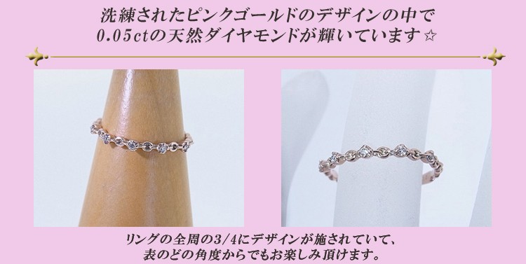 商品説明 洗練されたピンクゴールドのデザインリングです。0.05ctの天然ダイヤモンドがキラキラ輝いています。
