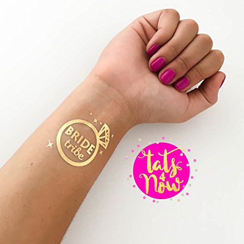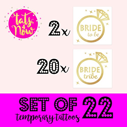 -. Feature : Perfect for Bachelorette party, Wedding, Bridesmaids / Each tattoo measures 2 inches x 2 inches / Gold temporary tattoos / Lasts 2-7 days / 16 total tattoos (14 Bride Tribe + 2 Bride)