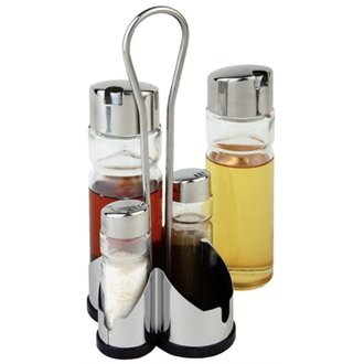 WIN-WARE Complete Cruet Set and Stand / Table Organiser. Inlcudes Vinegar Jars, Salt and Pepper shakers (with stainless steel lids) and a stand to hold it all