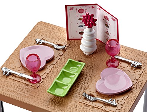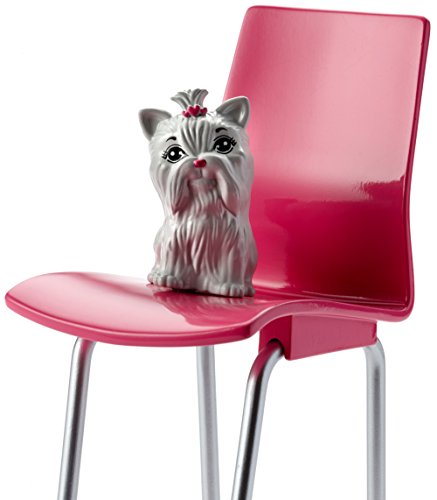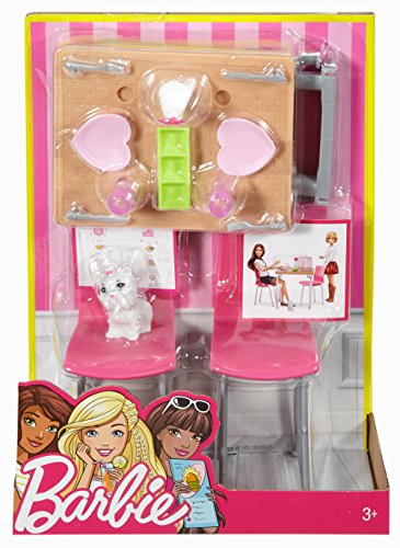 Enjoy a night indoors with the Barbie collection of indoor furniture plus pet packs, like this dining set with kitten. The furniture packs make it easy to spend a night in with fabulous furnishings, themed accessories and a pet friend for bonding. Arrange and rearrange the pieces to tell fun stories. The trendy furniture has signature style, and the realistic accessories open up the play possibilities. Barbie doll (sold separately) and her kitty friend can taste delicious food at this dining set. The “wooden” table and two pink chairs have silvery legs for a modern touch, and the accessories include breakfast, dinner and dessert. Two heart-shaped plates, two pink glasses, a green serving tray and two utensil sets dress up any meal. A vase with flower is a sweet touch. And a menu means you can order in or take out. The adorable white puppy is ready to share a meal or grab a dropped bite. Open the door to imagination with this play set that lets kids explore the fun to be had indoors. Add variety to Barbie doll’s play spaces by collecting all of her fabulous furnishings and accessories (each sold separately, subject to availability). Includes table, two chairs, themed accessories and adorable puppy friend; doll not included. Colors and decorations may vary.Feature