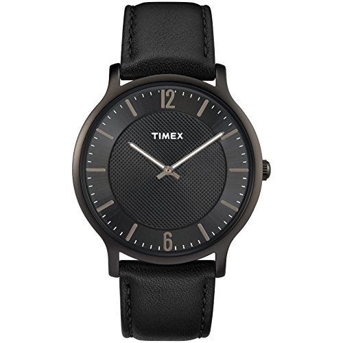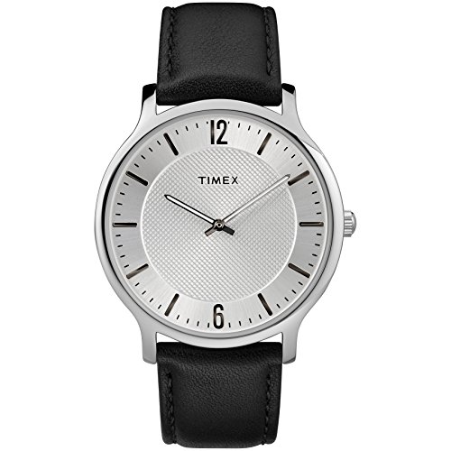 Stroll the city streets with the sharp Timex® Metropolitan Skyline Leather Strap watch! Stainless steel case. Leather strap with adjustable buckle closure. Round face. Three-hand analog display with quartz movement. Textured dial features tonal hands and hour markers, minute track, and Timex detailing. Water resistant 100 feet. Display case included. Imported. Measurements: Case Height: 40 mm Case Width: 40 mm Case Depth: 7 mm Band Width: 19 0⁄1 mm Band Circumference/Length: 9 in Weight: 1.2 oz This product may have a manufacturer's warranty. Please visit the manufacturer's website or contact us at warranty@support.zappos.com for full manufacturer warranty details.Feature