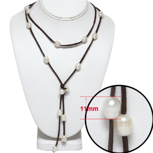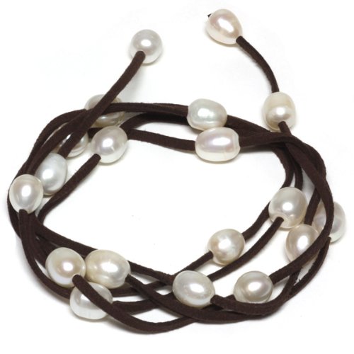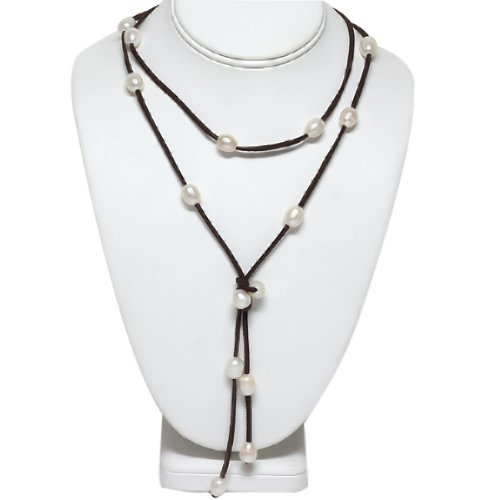 -. Title : 48" White Cultured Freshwater Pearl on Brown Leather Wrap Bracelet / Necklace