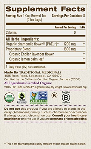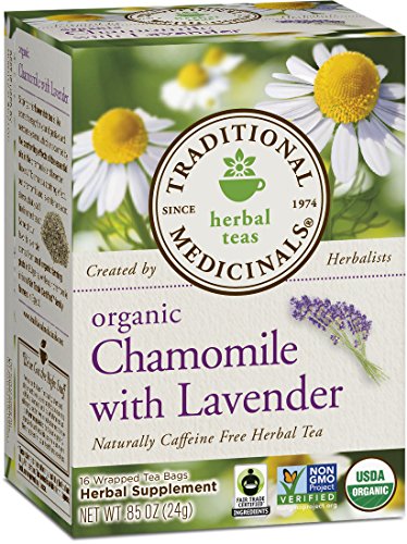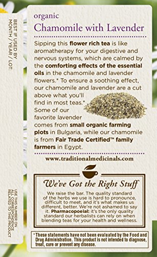 -. Binding : Grocery -. Brand : Traditional Medicinals -. EAN : 0032917000545 -. Feature : Settles your nervous system and relaxes your digestive system, especially good when stressed or tense* / Non-GMO verified; All Ingredients Certified Organic; 40% Fair Trade Certified(TM) ingredients; Kosher / The highest quality, pharmacopoeial grade herbs / Taste: Fragrantly floral and bittersweet / Case of six boxes, each box containing 16 sealed tea bags (96 total tea bags) -. Label : Traditional Medicinals -. LegalDisclaimer : Information about this product is provided for informational purposes and is not meant to substitute for the advice provided by your own physician or other medical professional. You should not use the information contained herein for diagnosing or treating a health problem or disease, or prescribing any medication. You should read carefully all product packaging. If you have or suspect that you have a medical problem, promptly contact your health care provider. Information and statements regarding dietary supplements have not been evaluated by the Food and Drug Administration and are not intended to diagnose, treat, cure, or prevent any disease. All discounts are taken from sested retail prices. -. Manufacturer : Traditional Medicinals -. MPN : TBCL -. NumberOfItems : 6 -. PackageQuantity : 6 -. PartNumber : TBCL -. ProductGroup : Grocery -. ProductTypeName : GROCERY -. Publisher : Traditional Medicinals -. ReleaseDate : 2006-02-08 -. Size : 16 bag -. Studio : Traditional Medicinals -. Title : Traditional Medicinals Organic Chamomile with Lavender Tea, 16 Tea Bags (Pack of 6) -. UPC : 032917000545