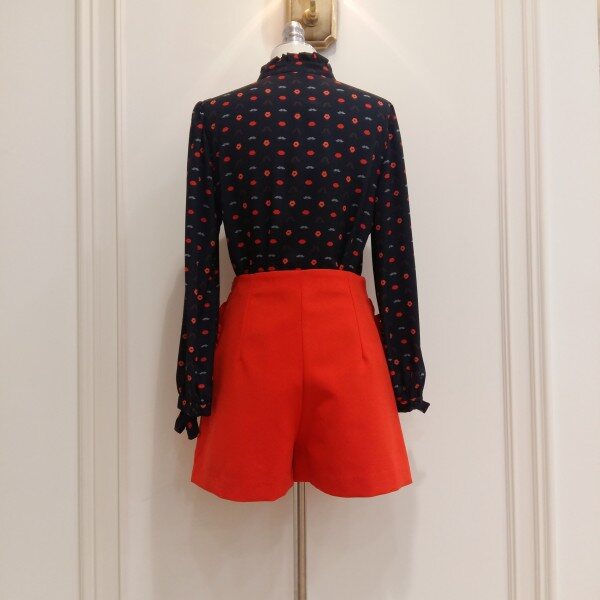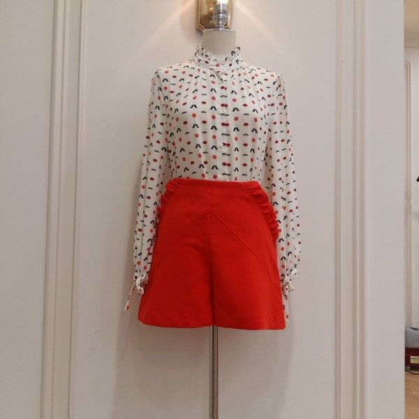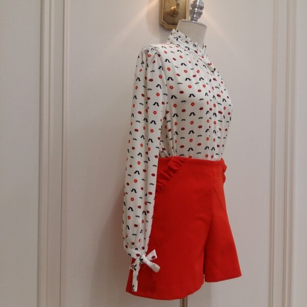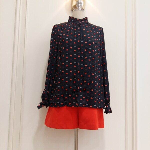 프린트가 깜찍한 패턴블라우스.소매에 리본으로 묶을수있게 코디
