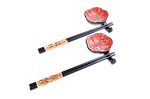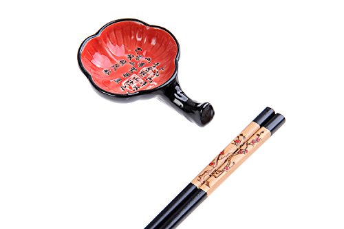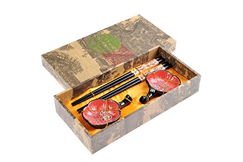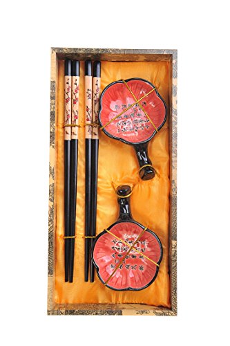 Abacus Asiatica: "Plum Blossom" elegant chopstick set in a decorative box, includes carved-wood chopsticks, rests, ceramic bowls (2 pairs of chopsticks, 2 rests, 2 bowls), Mod. CBS-S2-G-H02 (US)