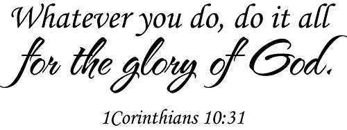 -. Binding : Kitchen -. Brand : WallDecalQuote -. Color : Black -. EAN : 0718196316484 -. Feature : ★ MADE IN THE USA - From 7 years indoor/outdoors self-adhesive Vinyl Material. / ★ DECAL IS MADE WITH HIGH QUALITY ORACAL 651 VINYL MATERIAL / ★ EASY TO APPLY: Sticker can be applied to any hard and smooth surface. Once the decal is on the wall the only thing left are the letters. ★ IT IS EASY TO REMOVE: No residue is left on the wall (note: decal is REMOVABLE but not REUSABLE). / ★ DECAL SIZE: 28" Wide x 13" High inches (71 cm Wide x 33 cm High). ★ DECAL COLOR: BLACK. / ★ EASY TO HANDLE: The whole quote comes on one single piece, which sticks to the wall. -. IsAutographed : 0 -. MPN : 14167402 -. PackageQuantity : 1 -. PartNumber : 14167402 -. ProductGroup : Home -. ProductTypeName : HOME -. Size : 28"W x 13"H -. Title : Wall Decal Quote 1 Corinthians 10 31 Whatever You Do Scripture Do It All For The Glory Of God -. UPC : 718196316484