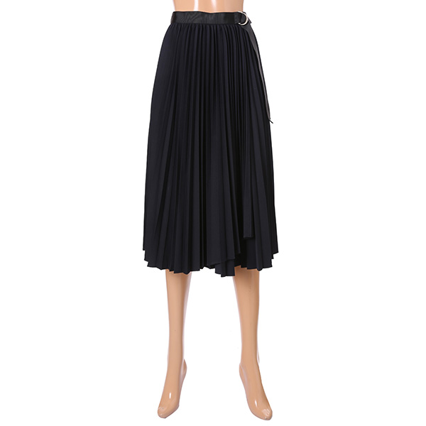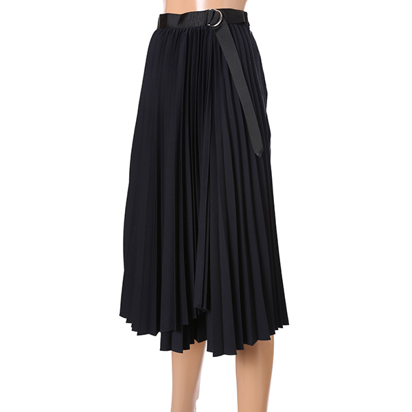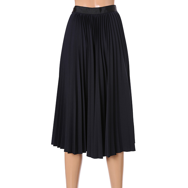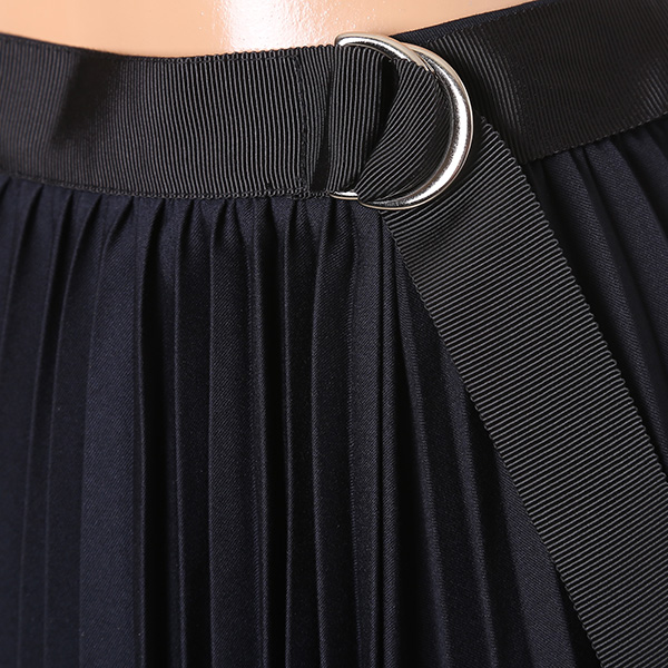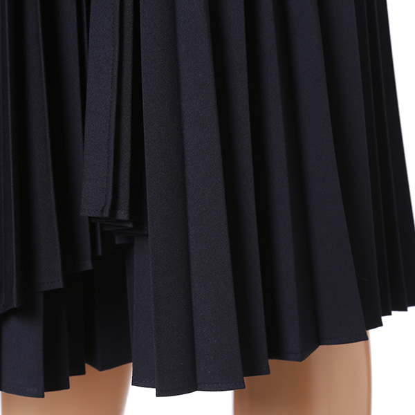 네이비 컬러에 아코디언 주름장식으로 포인트를 준 미디 스커트 입니다. 랩 스타일과 언발의 길이감이 트렌디함을 어필해 줍니다.