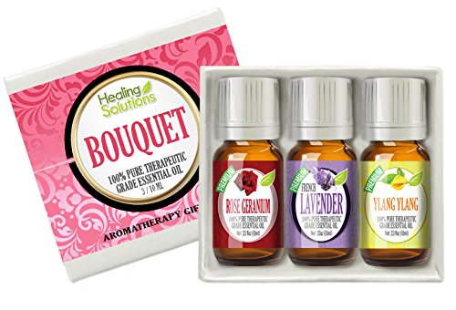 The Bouquet Essential Oil Gift Set contains the following therapeutic essential oils: French Lavender, Rose Geranium, Ylang Ylang. It's the perfect sampler kit, gift box set collection.