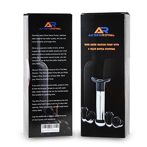 - In the package you should receive "Thank You Card" with operating instructions and Wine Saver Vacuum Pump with 4 reusable wine stoppers. Akses Royal provides 24-month warranty and great customer service. If you want to keep your wine FRESH, go head and click the buy button "Add to Cart"!