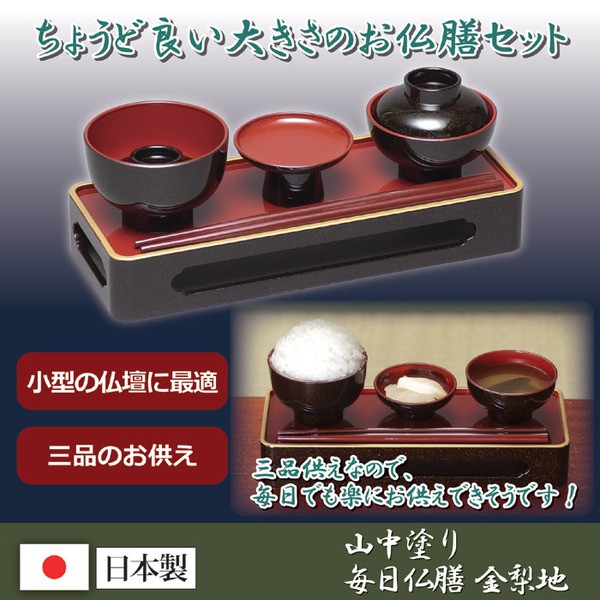 【商品名】 お仏膳セット/山中塗 毎日仏膳 金梨地 【三品供え/飯碗・汁椀・高月】 日本製 【ジャンル・特徴】 三品供えなので毎日でも苦に無くお供えできる!御仏膳セット 命日やお盆、お彼岸など大切な日にお供えするのに使う仏膳ですが、通常は、飯碗、汁椀、高月、壷椀、平碗の5つが基本です。しかし仏壇の大きさや、現代の住宅事情などで、普通の仏膳が置けないケースがあります。そんな時に便利な簡単仏膳はいかがでしょうか。飯碗・汁椀・高月の3種類の横並びになっています。3品なら毎朝のお供えもできそうです。命日やお盆など特別な日は普通の仏膳を使って、毎日のお供えは簡単仏膳にするなど使い分けすることもできます。表面はキラキラと光る金梨地になっており、お膳の縁金が高級感を出します。スタイルは色々でも供養する気持ちが大切ですね。■商品スペック【商品名】山中塗 毎日仏膳 金梨地 【サイズ】膳/約7.5×19.5×3.2cm 飯碗/約直径7.4×H5.1cm 汁椀/約直径6.8×H5.3cm 高月/約直径6.6×H3.4cm 箸/約20cm 【重量】約100g 【材質】ABS樹脂(山中塗り) 【付
