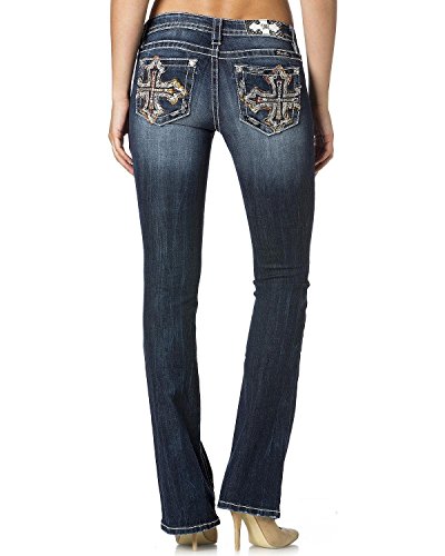 Dark wash mid rise boot cut denim jean with multicolored stitch cross design and studded accents