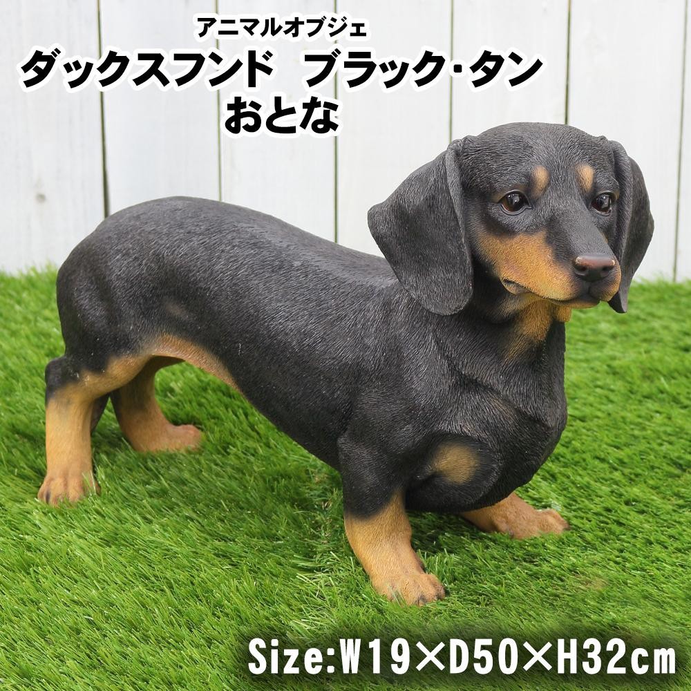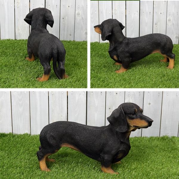 | インテリアや、ガーデンオーナメントにもぴったりな可愛い、ブラック・タンのダックスフンドのオブジェです♪きれいな仕上げで、まるで生きているかのような、愛くるしい表情が特徴です。 |