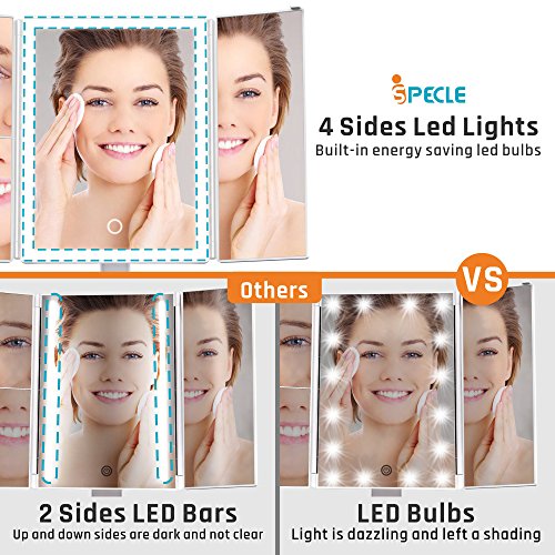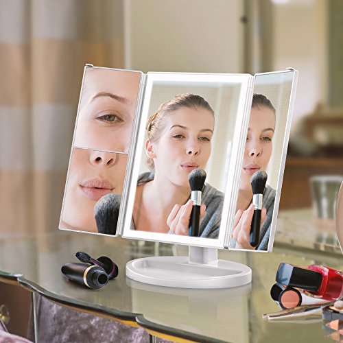 iSPECLE Lighted Makeup Mirror, Trifold LED Lighted Vanity Mirror with 180 Degree Rotation Touch Screen, 1 X 2X 3X Magnifications Brightness Table Countertop Cosmetic Make Up Mirror, White