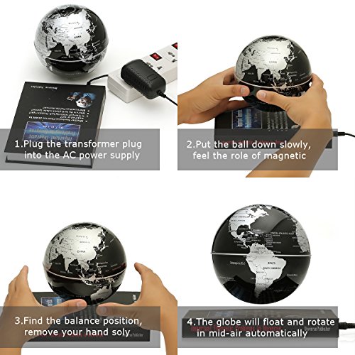 HOW-TO-USE 1.Please place the levitation device on a absolutely horizontal surface; 2.Switch on the power ; 3.Hold the goble with your hand;and put one finger on the base as underprops and move the south pole of the globe vertically downwards the center of the base. 4.Make the globe approach the center of the base slowly, and please move it towards left and right, or front and back to try to get the levitation point. 5.Position the globe 1/4 inch below the frame. When the globe is in the proper position, you will feel strong force holding the globe. Release the globe gently. 6.After set up;turn it or blow it,it will spin.But it stops spinning after about 5 minutes, go on turning it will spin again.
