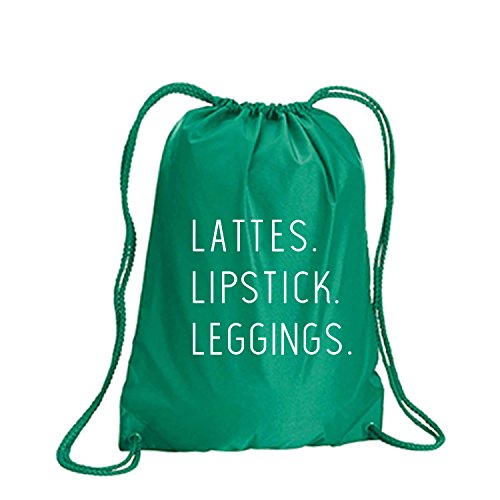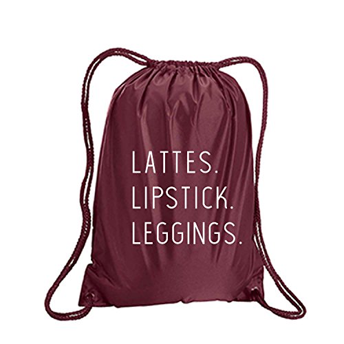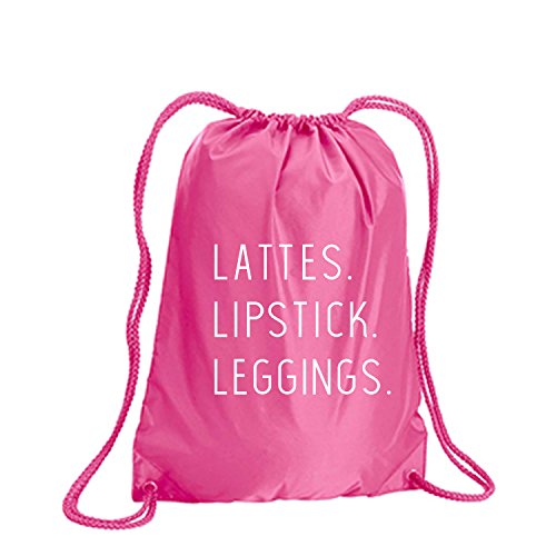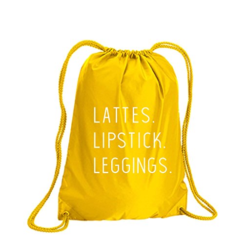 Product Description This durable and stylish nylon tote features "Lattes. Lipstick. Leggings." on a cinch pack tote with white ink. Bag comes in small and large sizes and is made of a durable 210 Denier nylon and has color-matched draw cords. Printed in the USA on an imported bag. 0