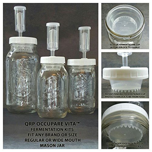 Studio : Quality Reliable Products Publisher : Quality Reliable Products Binding : Kitchen Product Description QRP Basic Food Fermentation Instructions included = Effortless Perfect Ferments Every Batch. During the fermentation process, the food expands and rises. QRP'S PATENT PENDING OCCUPARE VITA FERMENTATION FOOD RETAINER CUP situates on the mouth of a Mason jar where it stays in place, KEEPS ALL FOOD SUBMERGED in the brine (juices) making the system MOLD-PROOF, and PREVENTS MESSY OVERFLOW. Costly glass or ceramic weights can chip or burst during the fermentation process for no apparent reason causing waste of the entire batch. Experienced fermenters know that AIRLOCKS are dependable in observing the release of oxygen bubbles, which reveals and confirms active fermentation. The Airlock allows the system to exhale oxygen and prevents re-entry. QRP 3-Piece Water Airlocks are easy to un-assemble and rinse, unlike lids without airlocks where food particles get trapped underneath difficult to remove and replace seals and date markers. The QRP lid reserves space for a date label. The QRP Fermentation Kits include Silicone Seals which fit snug into the Mason jar plastic lids and provide a perfect airtight, anaerobic enclosure while fermenting Pickles, Kimchi (vegetables) or Kombucha (tea) and are EASY TO REMOVE for cleaning. Metal lids or rings shouldn't be used for fermentation, nor for storage of fermented foods due to eventual corrosion. QRP products were developed to help our director overcome prostate cancer. ALL QRP parts are USDA Food Grade and produced by a reputable food container manufacturer. Free recipes can be readily found on the internet. ⓒ 2016 Quality Reliable Products, All Rights Reserved. 0