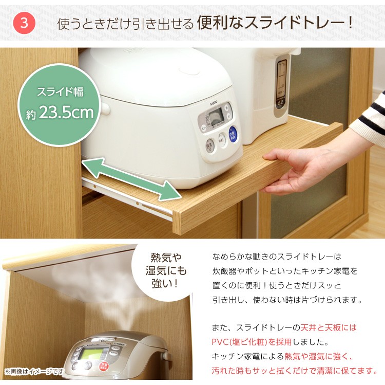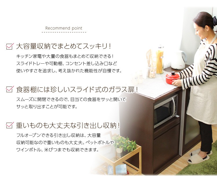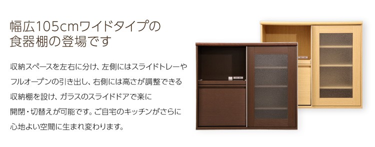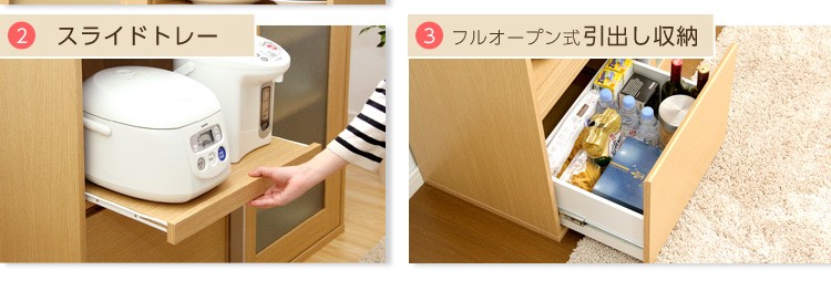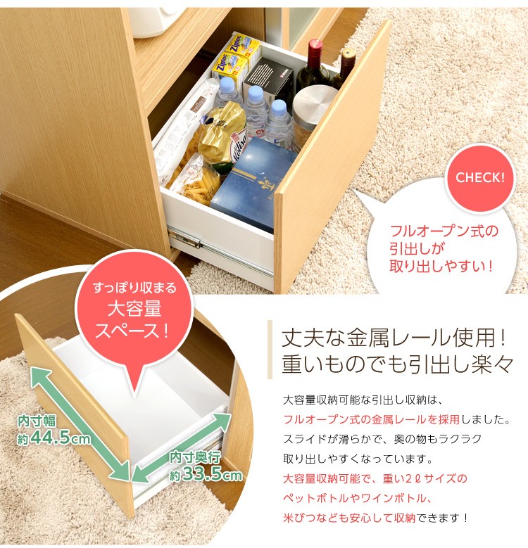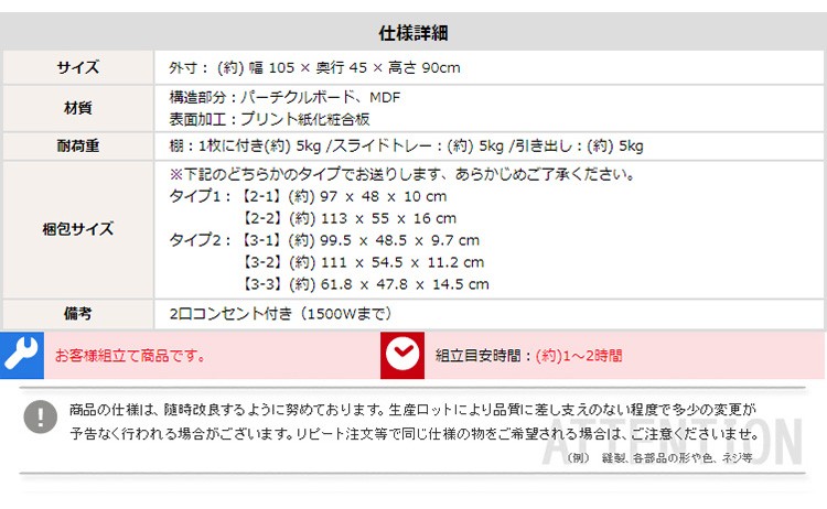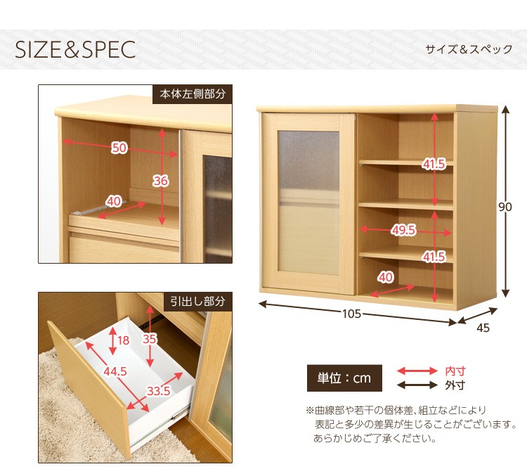 ※メーカー直送のため代金引換はお受けできません。※こちらの商品は、北海道・沖縄・離島へのお届けはお受けしておりません。■最大外寸:幅105×奥行45×高さ90cm■右棚内寸:幅50×奥行40×高さ 上/下41.5cm■スライドトレー部 内寸:幅50×奥行40~63×高さ36cmcm■引出し内寸:幅44.5×奥行33.5×高さ35(18)cm■カラー:ナチュラル・ダークブラウン■仕様:スライドトレー付き/ 二口コンセント(合計1500W)付き※お客様組み立て家具
