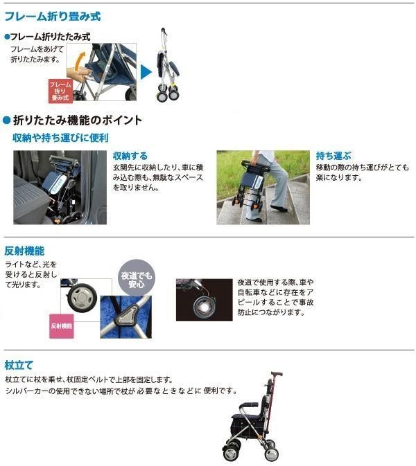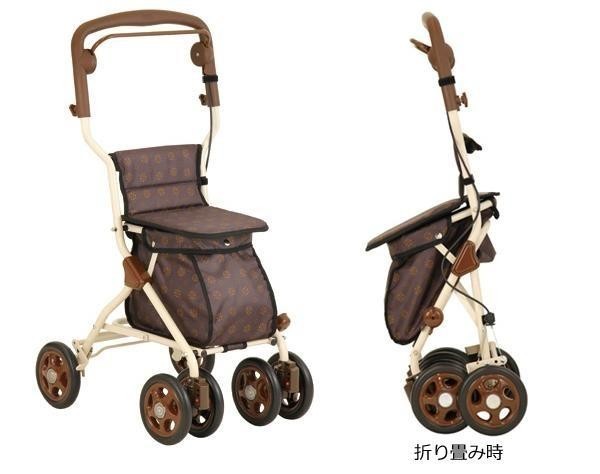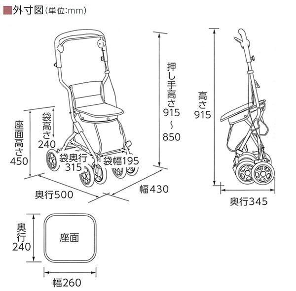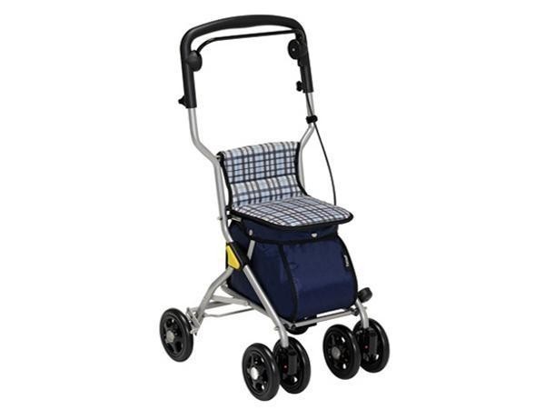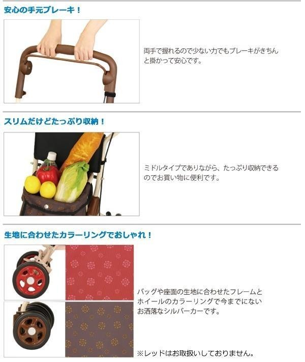コンパクトタイプとスタンダードタイプの間に位置する、使い勝手の良いシルバーカーです。軽量でありながら安定感があり、適度な収納量なので、毎日のお買いものにも最適です。歩行で疲れた時は座って休むこともできます。 |