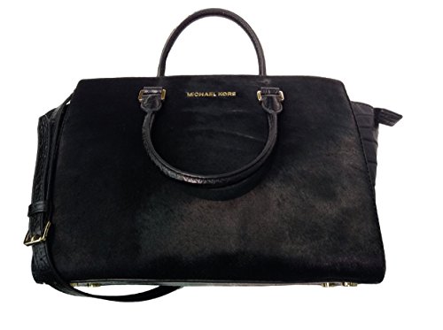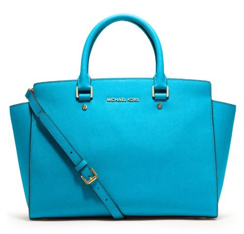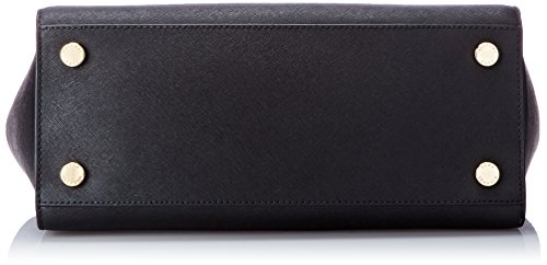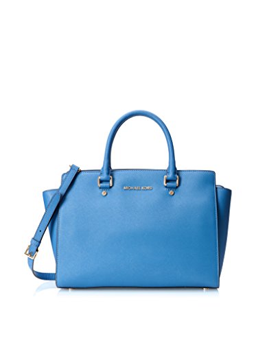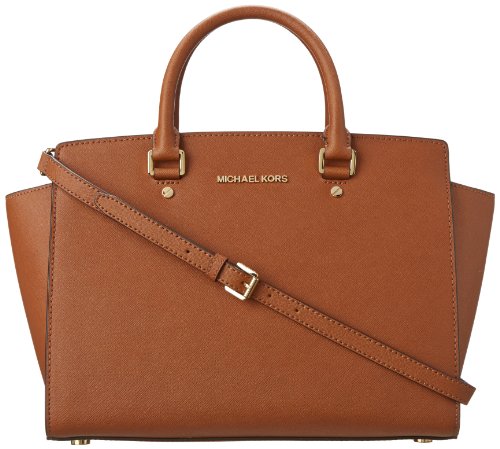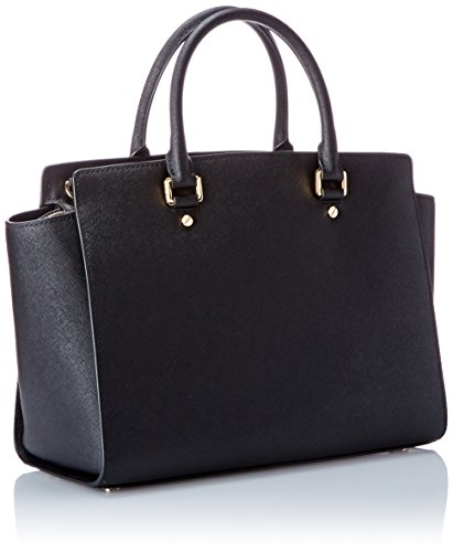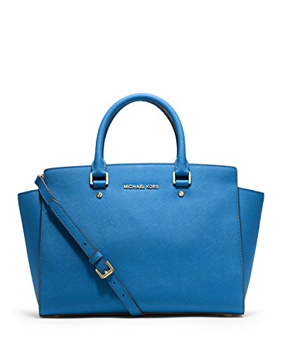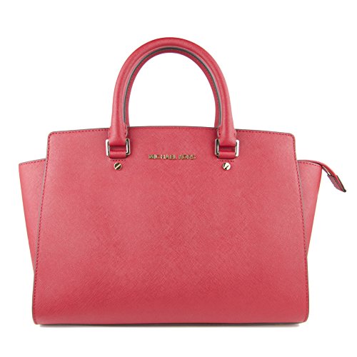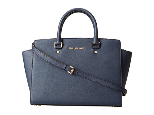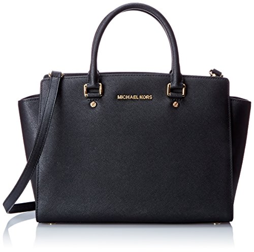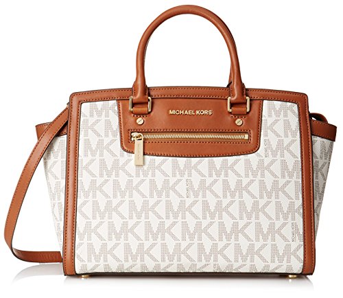 A luxe saffiano leather MICHAEL Michael Kors satchel in a classic silhouette. Gold-tone lettering details the front, and an inset zip opens to a logo-lined interior with 4 notch pockets and a zip pouch. Metal feet. Double rolled handles and optional shoulder strap. Dust bag included.Feature