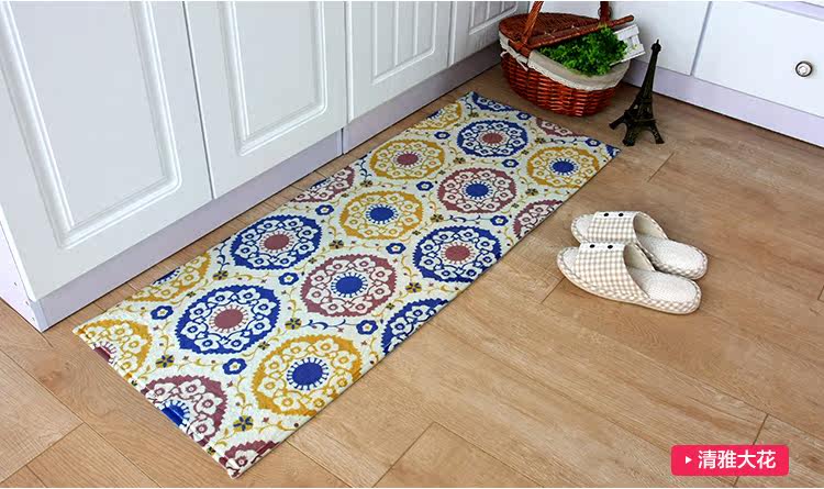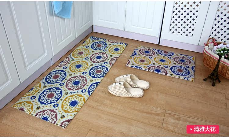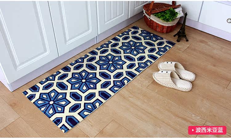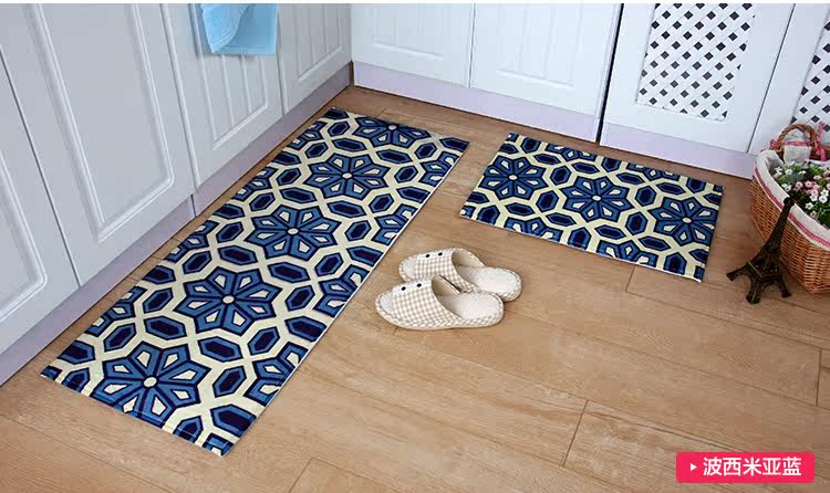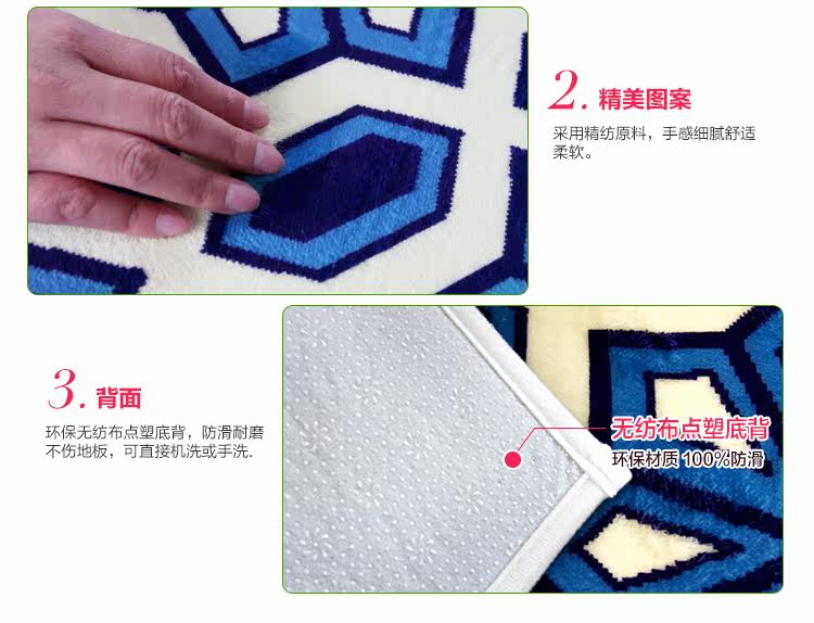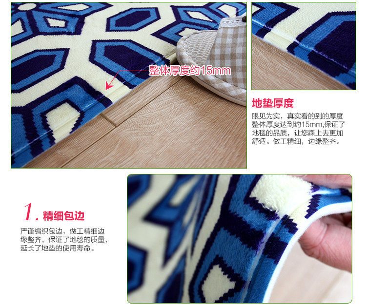 Product name Fabrics and materials Back Size Weight Thickness Color Washing method Reminder Jinjiali green dye super soft anti slip carpet High quality cashmere blended. Non-woven fabric point of plastic backing About 40*60cm and 45*120cm About 480G/2 pieces The overall thickness of about 15mm Cutlery jigsaw puzzle / Bohemia - Blue Can be washed, washing machine, flat to dry 1, because of personal display brightness contrast display differences, pictures and objects may have slight color difference is a normal phenomenon 2, due to manual measurement, if 2-4cm errors are within reasonable limits |