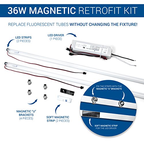 - ✔ QUICK AND EASY INSTALL – Replacing fluorescent lighting has never been easier. Simply attach the magnetic retrofit LED kit inside the existing fixture and install in minutes! One retrofit kit can replace up to FOUR fluorescent tubes or a 2x4 troffer or panel. No special tools required.