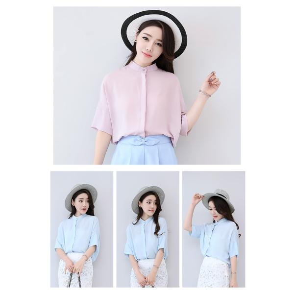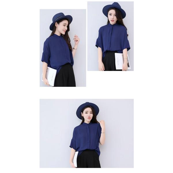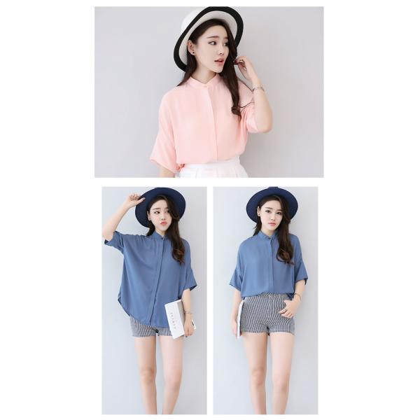 プチハイネックドルマンシャツブラウス レディース トップス 半袖 無地 2017 新作涼しげなシフォン素材のシャツブラウスは夏コーデにぴったり♪シンプルで合わせやすいデザインは、幅広いスタイルと相性抜群!ぴったりとしすぎないサイズ感ながら、綺麗なシルエットで着られます◎【カラー】オレンジ・ホワイト・ライトブルー・レッド・ネイビー・ブルー・ピンク【サイズ】[S]胸囲114/袖丈11/丈67/肩幅58.6(cm)[M]胸囲118/袖丈11.2/丈68/肩幅60.2(cm)[L]胸囲112/袖丈11.4/丈69/肩幅61.8(cm)※製品により多少の誤差が生じる場合がございます。【素材】ポリエステル【ご使用上の注意】着用に問題のない製法のほつれ、商品の性格上、開封された商品・一度でも着用されました商品の返品・交換は一切お受け致しません。イメージと違う、サイズが合わない等の理由での返品は一切受け付けておりません。購入後のサイズ交換は対応しておりません。生産終了後すぐ発送しているため匂いがある場合がございます。ご了承ください。【生産国】made in china※商品はご注文を頂いてから2週間前後の到着となります。