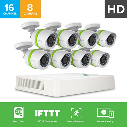 EZVIZ HD 720p Outdoor Surveillance System, 8 Weatherproof HD Security Cameras, 16 Channel 2TB DVR Storage, 100ft Night Vision, Customizable Motion Detection