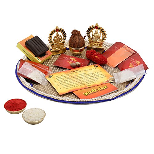 - Package Contains: 1 Decorated Pooja Thali, 1 Idol of Ganesh Ji, 1 Idol of Laxhmi Ji, 1 Pouch of kumkum, 1 pouch of Sindoor, 1 pouch of Akshat, 1 aarti book, 1 prarthna book, 1 packet of dhoop, 1 shreefal, 1 mouli bundle, 1 packet of mishery, 1 betalnut, 1 kalash, 2 containers.