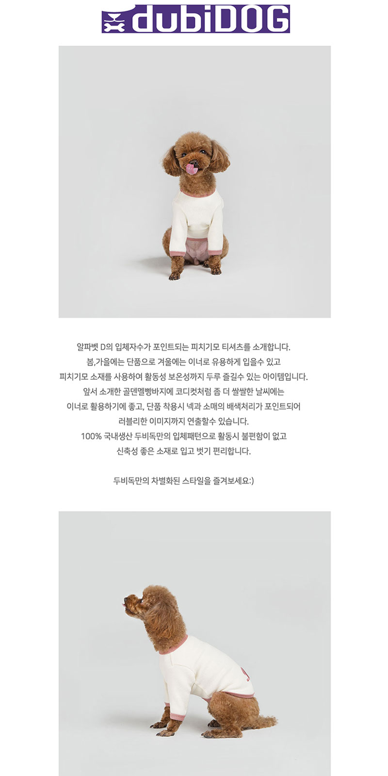 | 알파벳 D의 입체자수가 포인트되는 피치기모 티셔츠를 소개합니다. 봄,가을에는 단품으로 겨울에는 이너로 유용하게 입을수 있고 피치기모 소재를 사용하여 활동성 보온성까지 두루 즐길수 있는 아이템입니다. 앞서 소개한 골덴멜빵바지에 코디컷처럼 좀 더 쌀쌀한 날씨에는 이너로 활용하기에 좋고, 단품 착용시 넥과 소매의 배색처리가 포인트되어 러블리한 이미지까지 연출할수 있습니다. 100% 국내생산 두비독만의 입체패턴으로 활동시 불편함이 없고 신축성 좋은 소재로 입고 벗기 편리합니다. 두비독만의 차별화된 스타일을 즐겨보세요:) |