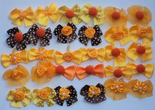 -. Binding : Misc. -. Brand : JJ Couture -. Color : Orange, Brown -. EAN : 0700220543287 -. Feature : 40 Bows per pack (20 pairs of different combination of Pom, Flower and Beads) / Each bow is approximately 1.5 to 2 inches in diameter / There are either two tail bows or the butterfly bows in this lot / Great dog bows for groomers and pet owners for the fall season / Each bow has the double looped rubber band for easy attaching to the doggie's hair. -. Label : PET Expressions GA -. Manufacturer : PET Expressions GA -. MPN : 8753 -. NumberOfItems : 40 -. PackageQuantity : 40 -. PartNumber : 8753 -. ProductGroup : Pet Products -. ProductTypeName : PET_SUPPLIES -. Publisher : PET Expressions GA -. Size : s -. Studio : PET Expressions GA -. Title : 40 Dog Grooming Hair Bows-1.5 inch Fall Collection-Bright Orange and Brown -. UPC : 700220543287