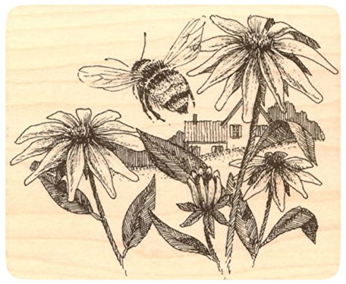 -. Title : {Single Count} Unique & Custom (4 1/4" by 3 1/2" Inches) "Bee & Flowers Countryside Scene" Rectangle Shaped Genuine Wood Mounted Rubber Inking Stamp