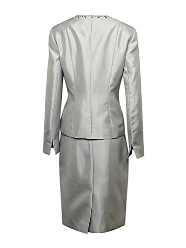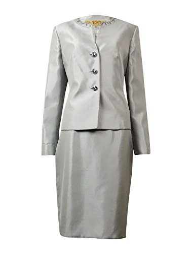 Studio : Kasper Publisher : Kasper Binding : Apparel Product Description Set includes jacket and skirt. Jacket features full lining, embellished neckline, optional length sleeves, slub woven fabric, and three button front closure. Skirt features full lining, back center vent, woven slub fabric, pencil silhouette, and concealed back zipper closure. 0