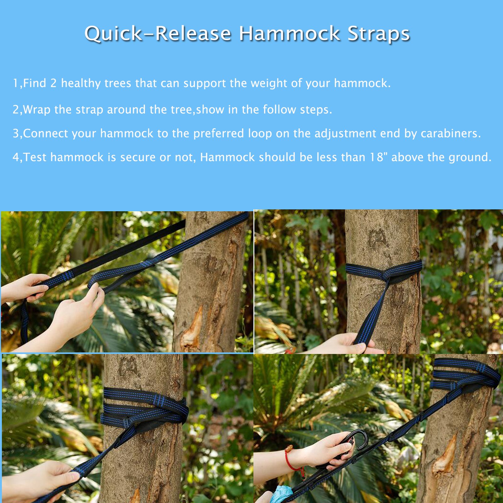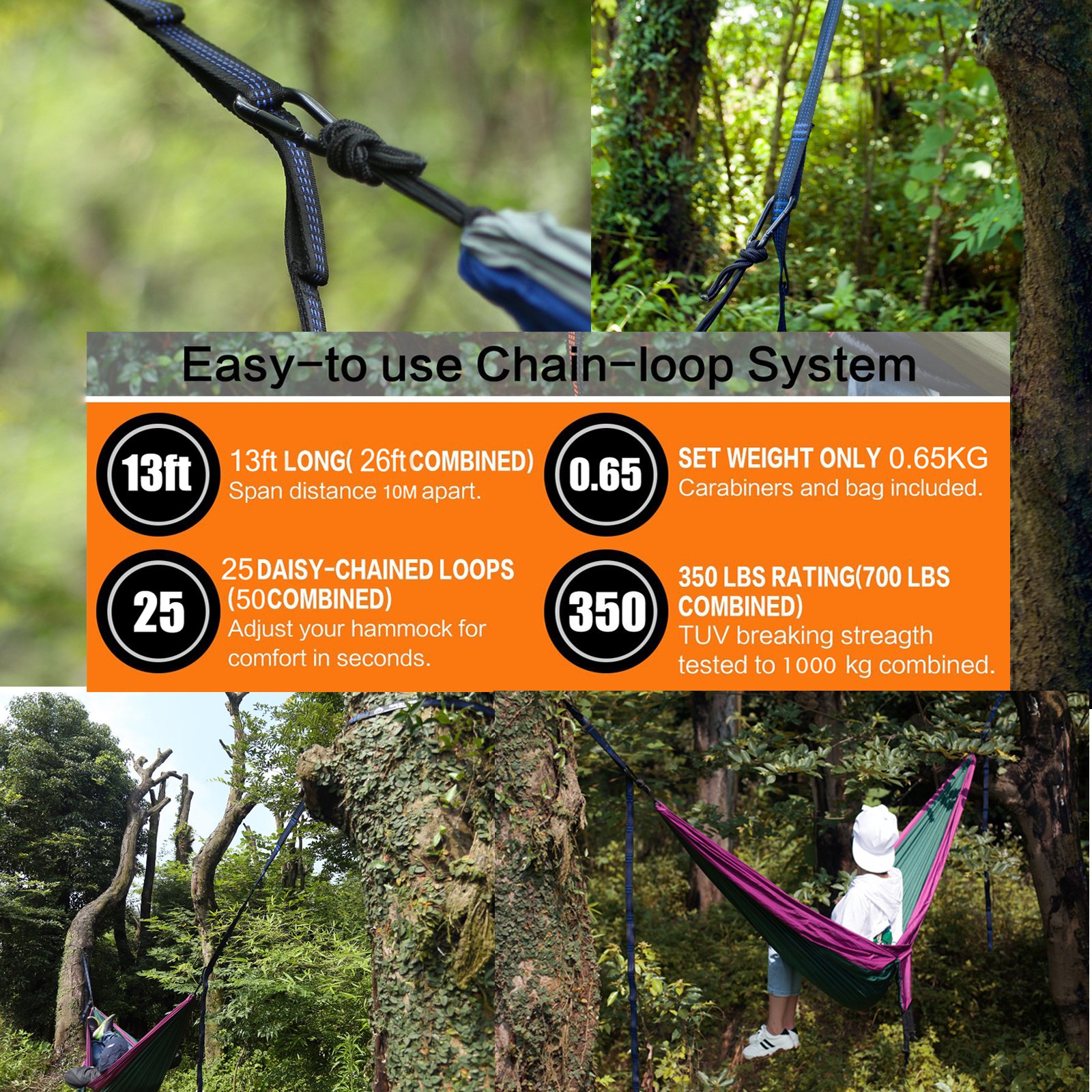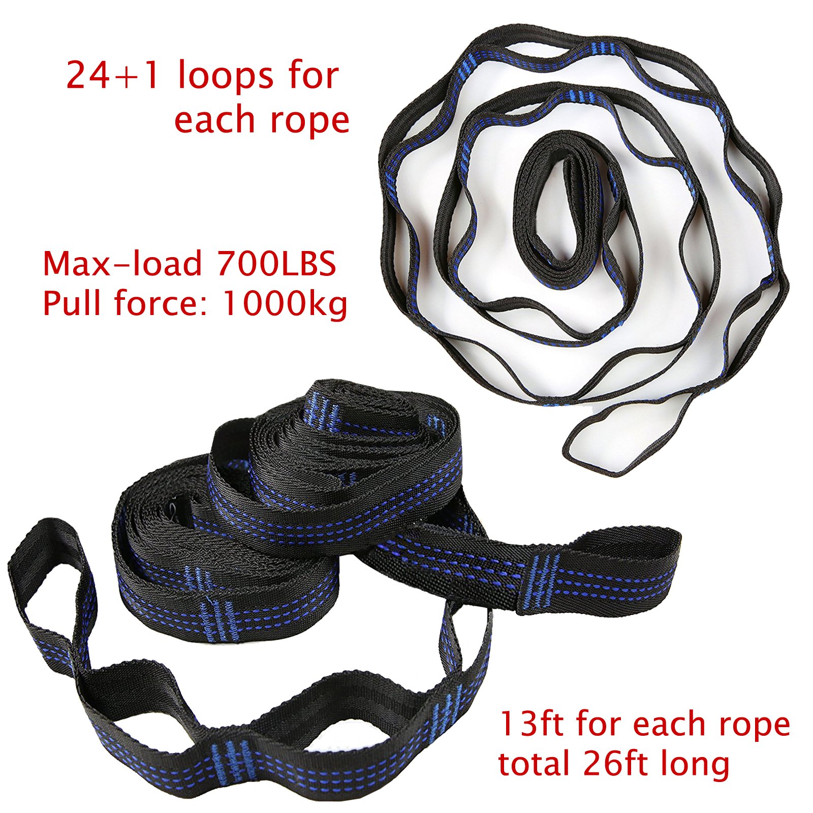 Two sets of hammock straps have a tensile force of 500 kg or more (total 1000 kg), withstand load of 300 kg (total of 600 kg).
