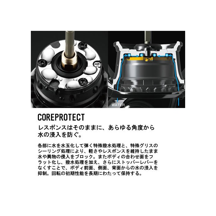 코어 프로텍트:물방울을 형성해 수를 연주하는 발수 처리(물방울 효과)를 각부에 배치하고, 회전 Response나 가벼움을 유지한 채로 바디 내부에의 수나 이물질의 침입을 블럭 합니다.탑재 개소는,로터와 바디간에 배된 스토퍼 베어링,바디,라인 롤러의 3개소.비접촉 씰은 회전이 가벼운 데다가 마모 하지 않고,성능은 장기간 유지해집니다.바디 합해면을 플랫화 하고, 발수 처리를 더하고, 스토퍼 레버를 없애는 것에,바디 전면은 물론,측면,배면에서도 수의 침입을 억제하고, 회전 초기 성능이 장기간 유지됩니다.