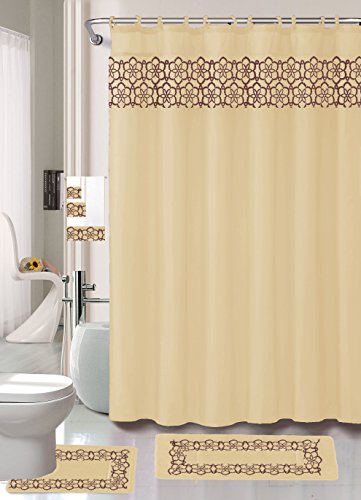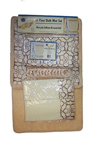 18 Piece Elegant Bathroom Set: 2-Rugs/Mats (1-Contour Rug, 1-Bath Mat) Poly Acrylic Pile Rubber Backing, 1-Fabric Shower Curtain, 12-Fabric Covered Rings, 3-Piece Decorative Towel Set (Beige)