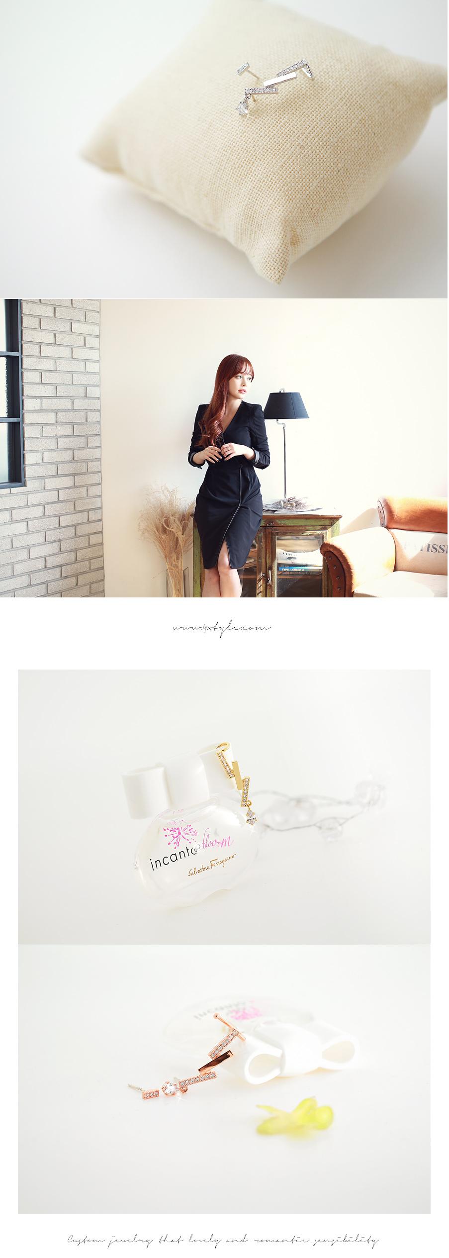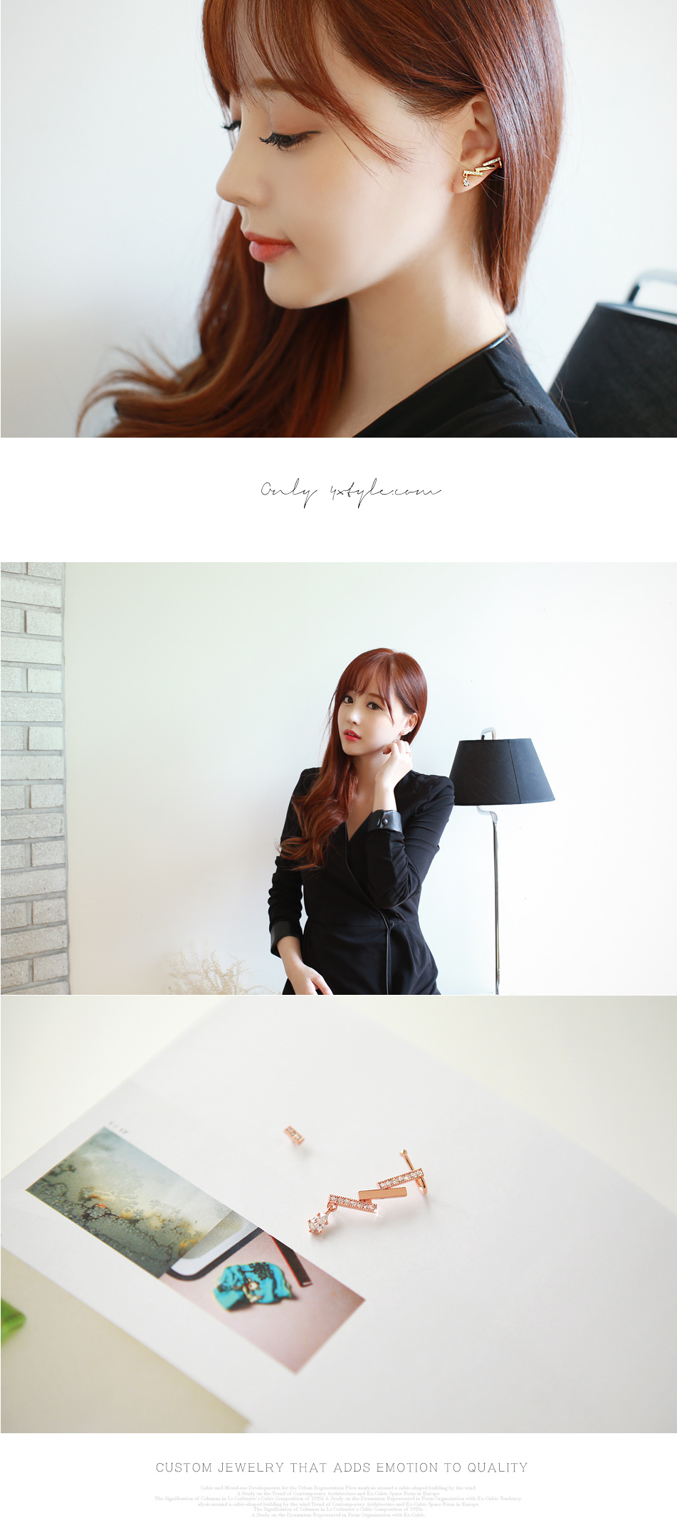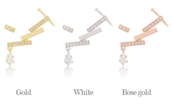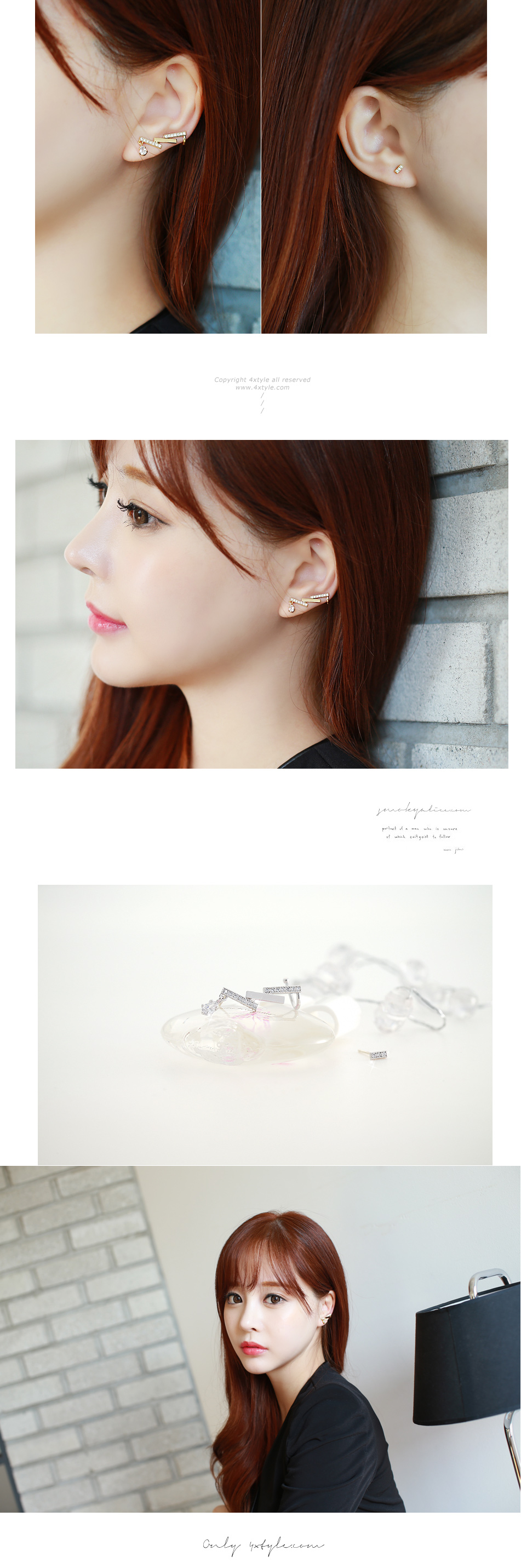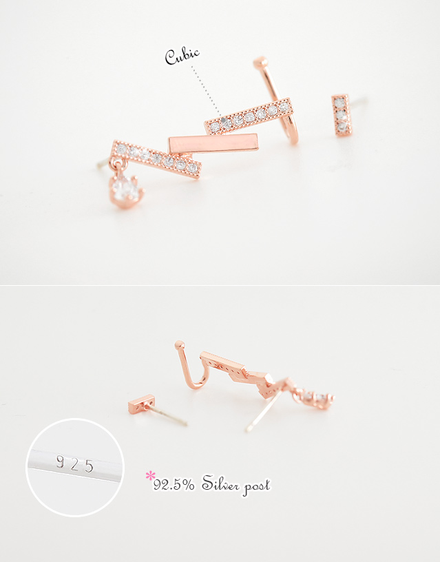 작은 큐빅이 촘촘하고 깔끔하게 셋팅된 제품이예요. 좌우가 다른 언발란스한 디자인으로 침을 꽂고 위에서 한번 더 고정해주는 제품입니다. 92.5% 실버침으로 알러지 안심하세요!