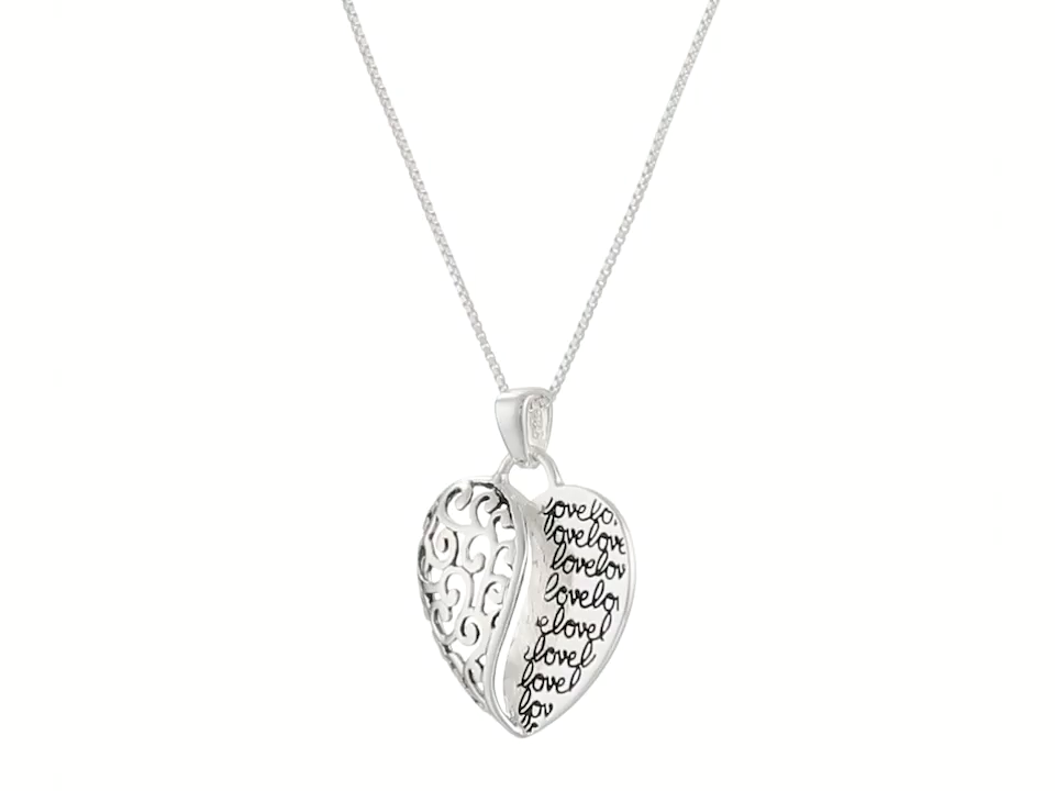 Sterling silver necklace featuring stacked heart pendant with filigree cutouts and engraved cursive "love" pattern^Engraving on back: "Mother and Son forever"^18" box chain with spring-ring clasp^Crafted in .925 sterling silver^Imported