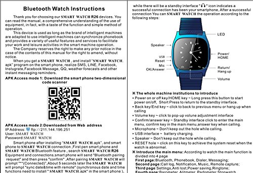 Language: English, Chinese; Universal features: hands-free calls, instant message remind, pedometer, music, burglar alarm, music, altitude meter, stopwatch, remote photo shooting and so on; Supported by Andriod phone: sync Facebook / SMS / QQ and more