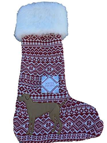 Red and White Knit Christmas Stocking Trimmed in White Faux Fur - Gold Weimaraner or Lab