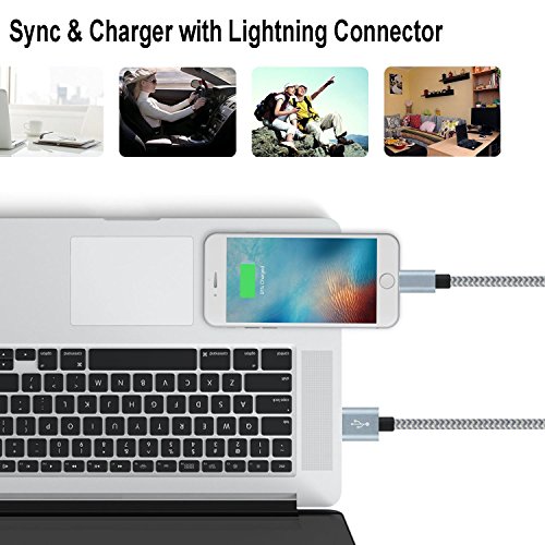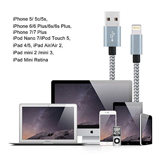 Frieso kka91607 3' Lightning Cable, Nylon Extra Long USB Cord Charging Cable For Iphone7,7plus,SE,6s,6s Plus,6plus,6,5s 5c 5,Ipad Mini,Air,Ipad5,Ipod - Gray - 3 Piece