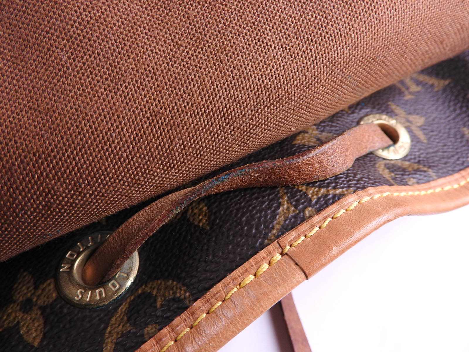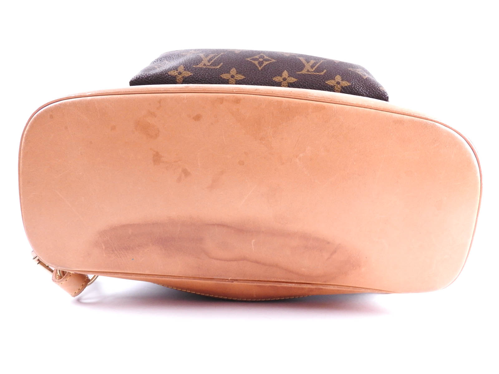 Monogram: Used feeling. Small scratches and stains. Leather: Used feeling. Tanned. Some scratches, stains, wrinkles and abrasions. |