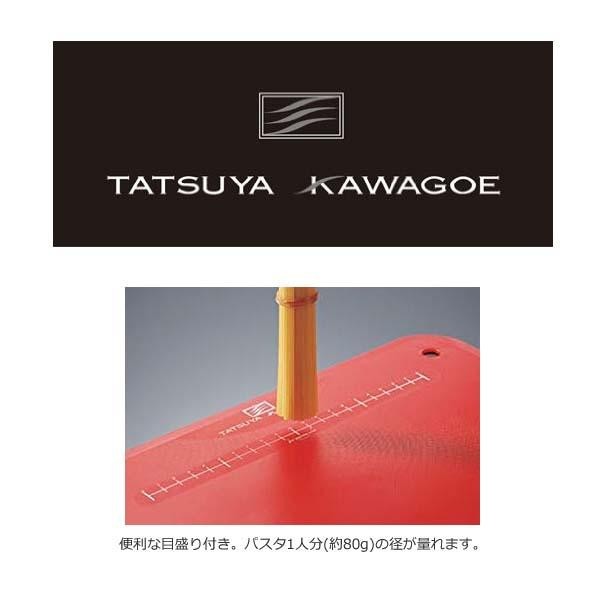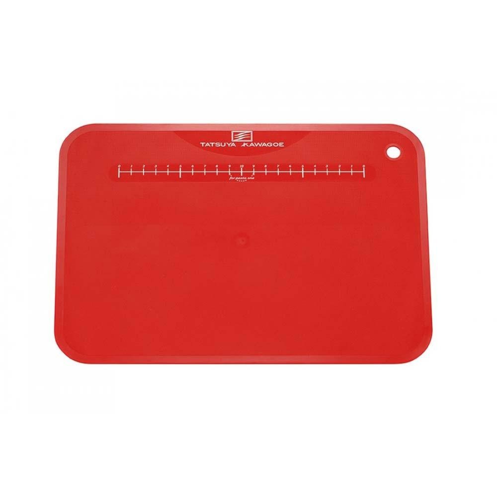 鮮やかな赤が目を引くオシャレなカッティングボードです。便利な目盛り付きで、パスタ1人分(約80g)の径が量れます。