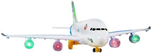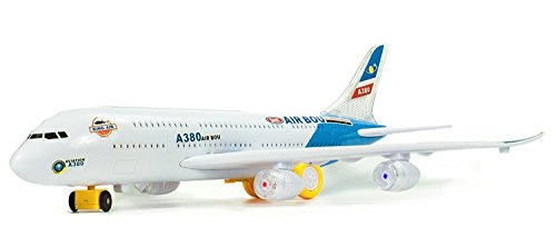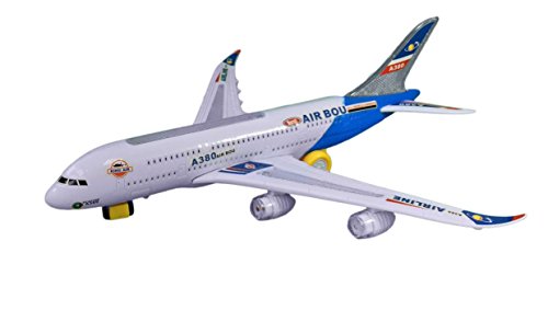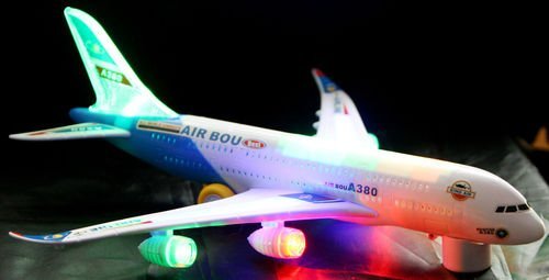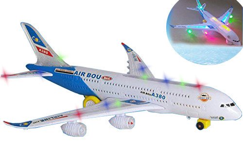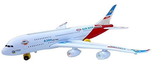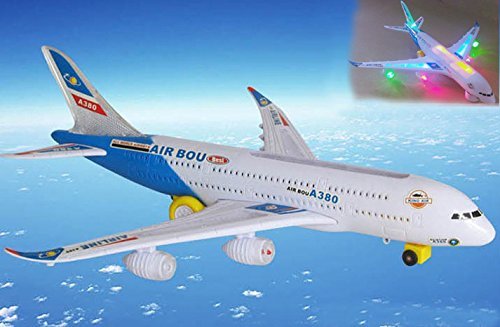 -. Binding : Toy -. Brand : ToyZe -. EAN : 0627304171610 -. Feature : Airbus A380 Plane Bump's and Go's without stopping, if he bumps into anything he will just back out and continue his journey / The Jet has bright flashing lights giving a child the understanding of how the A380 Airplane moves and looks. / Huge 18 Inch toy model beautiful to have on display at you home or workplace. / Looks like the actual A380 airplane great toys for boys and for girls. / Requires 3 AA batteries. (Batteries not included.) -. IsAdultProduct : 0 -. Label : ToyZe -. Manufacturer : ToyZe -. ProductGroup : Toy -. ProductTypeName : TOYS_AND_GAMES -. Publisher : ToyZe -. Studio : ToyZe -. Title : Toyze A380 Airplane Airbus Toy Model With Beautiful Attractive Flashing Lights and Loud Music, Bump and Go Action -. UPC : 627304171610
