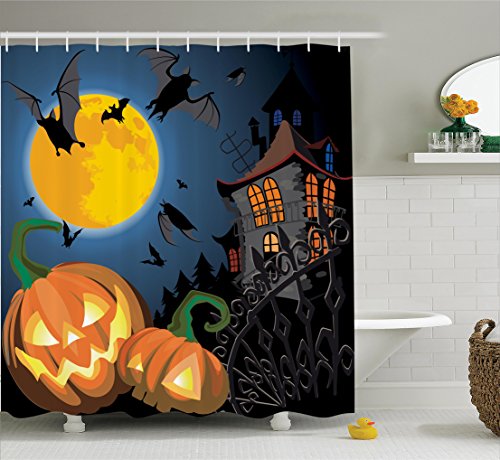 Halloween Decorations Shower Curtain Set By Ambesonne, Gothic Scene With Halloween Haunted House Party Theme Decor Trick Or Treat For Kids, Bathroom Accessories, 69W X 70L Inches, Multi