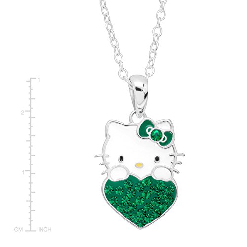 The perfect gift for the May-born in your life! Celebrate with this Hello Kitty heart pendant, crafted in sterling silver-plated brass, featuring round-cut green crystals. Piece measures 1 by 5/8 inches. Comes with a sterling silver-plated brass 18-inch cable chain with a spring ring clasp.Feature