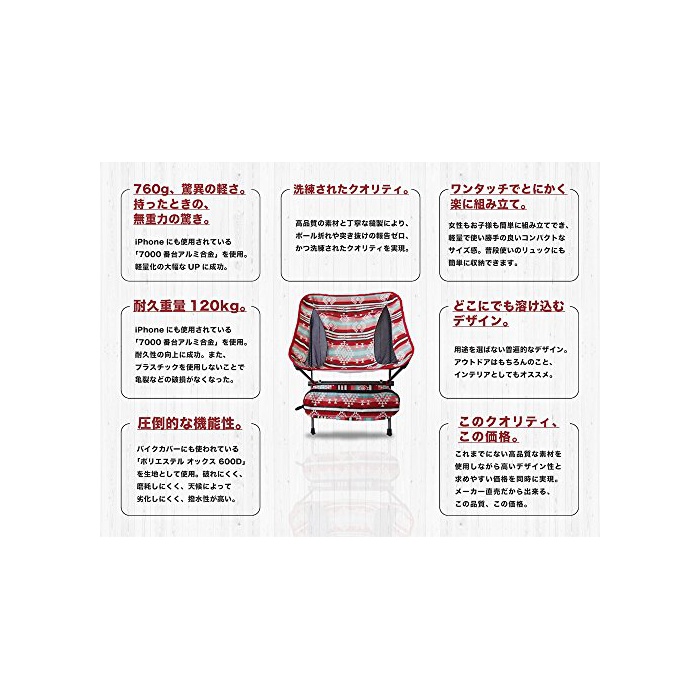 캠프 씬뿐만 아니라 여러가지 아웃도어 씬으로 간단하게 운반,수납 할 수 있는 바와 같이(하도록) 개발 된 콤팩트 체어.