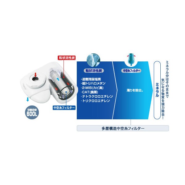 注意:1、日本工業規格:JIS S 3201 試験結果。2、商品の浄水能力は、JISの試験方法で定められた条件下で各項目毎に計測した浄水能力を個別に表示したものです。3、実際の水道水の水質やろ過流量などの違いによってろ材の取換時期の目安は変わることがあります。