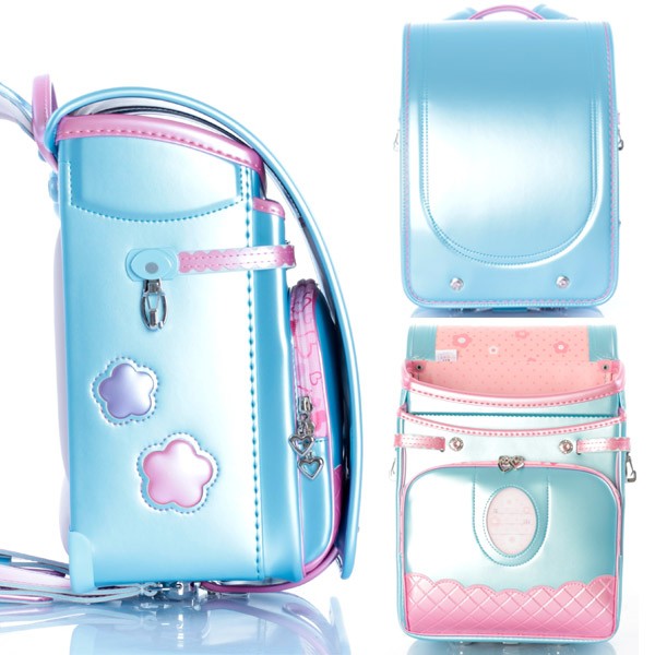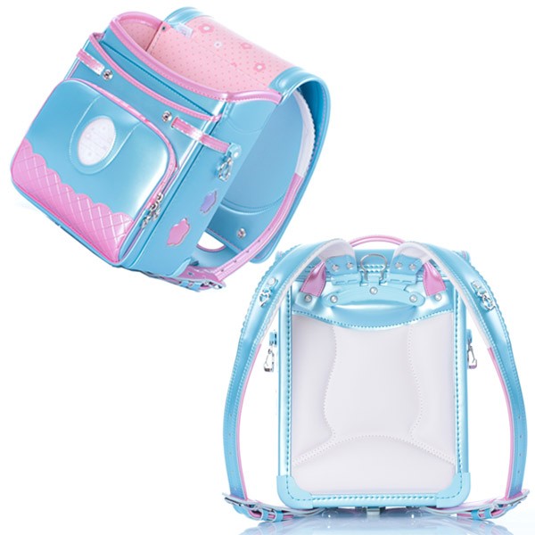 内装:ピンクドット、錠前:ワンタッチロック、ポケット:ワイドポケット・内装総内張り・小ナスカン付、肩ベルト:ふわりぃ仕様・長尺・9穴・右(ハートカン)・左(小ナスカン)、鋲:クリスタルサークル、ナスカン:反射材付、冠裏:フラワー、反射材:冠下部・前締め・肩ベルト、固定型持ち手、カラー:パールスカイ×パールピーチ